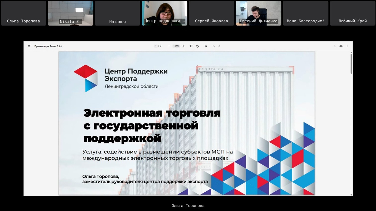 Заместитель руководителя Центра поддержки экспорта Ольга Торопова рассказала участникам вебинара алгоритм получения услуги. Компания должна относится к категории малого или среднего бизнеса, быть зарегистрированной на территории Ленинградской области. На портале «Мой экспорт» воспользоваться услугой "Онлайн-помощник по маркетплейсам" и получить персональную стратегию по электронной торговле. Полученный отчет подгрузите при подаче заявки на сайте ЦПЭ.
