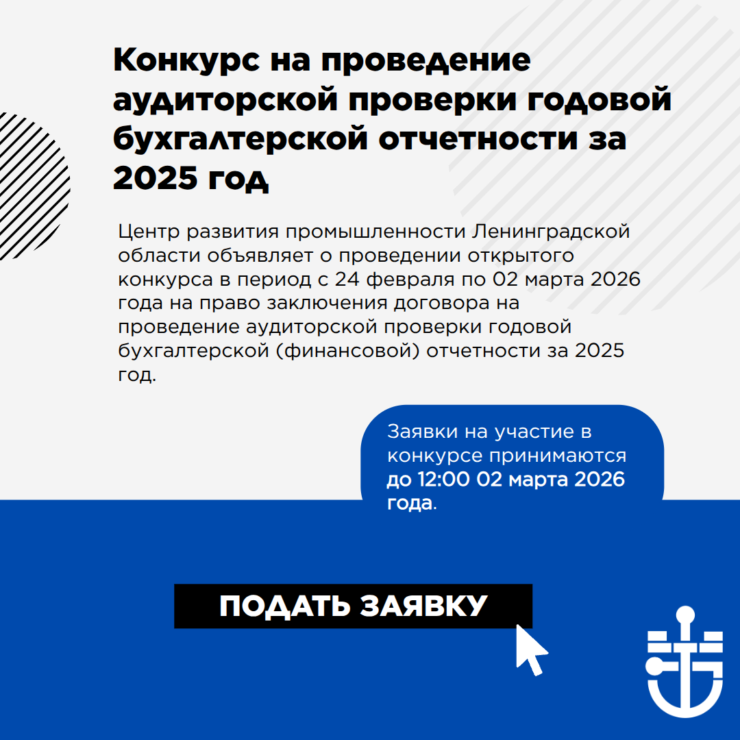 Центр развития промышленности Ленинградской области объявляет о проведении открытого конкурса в период с 24 февраля по 02 марта 2026 года на право заключения договора на проведение аудиторской проверки годовой бухгалтерской (финансовой) отчетности за 2025 год.